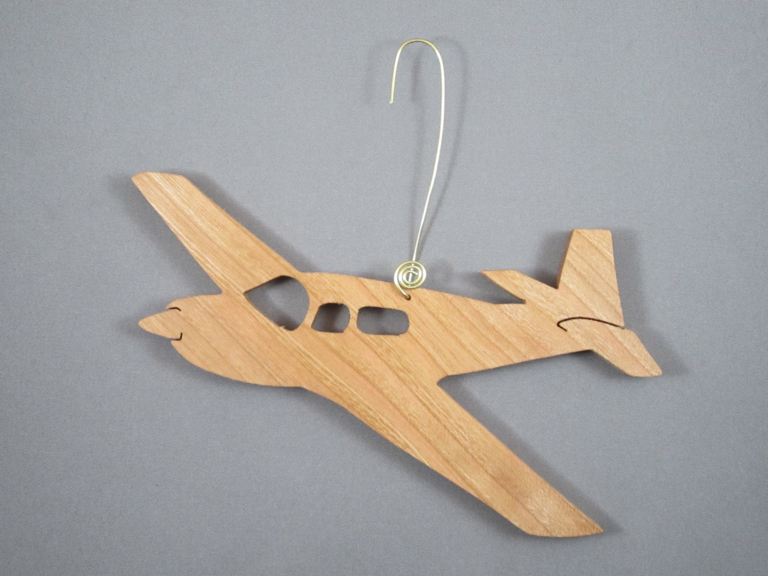 This, cherry wood, Mooney Airplane was hand scrolled sawed. It measures 1/4" thick, 5" across and 3 1/2" tall.It has an oil finish on it for lasting beauty of the cherry wood.For easy hanging a handmade, brass, hanger was added.