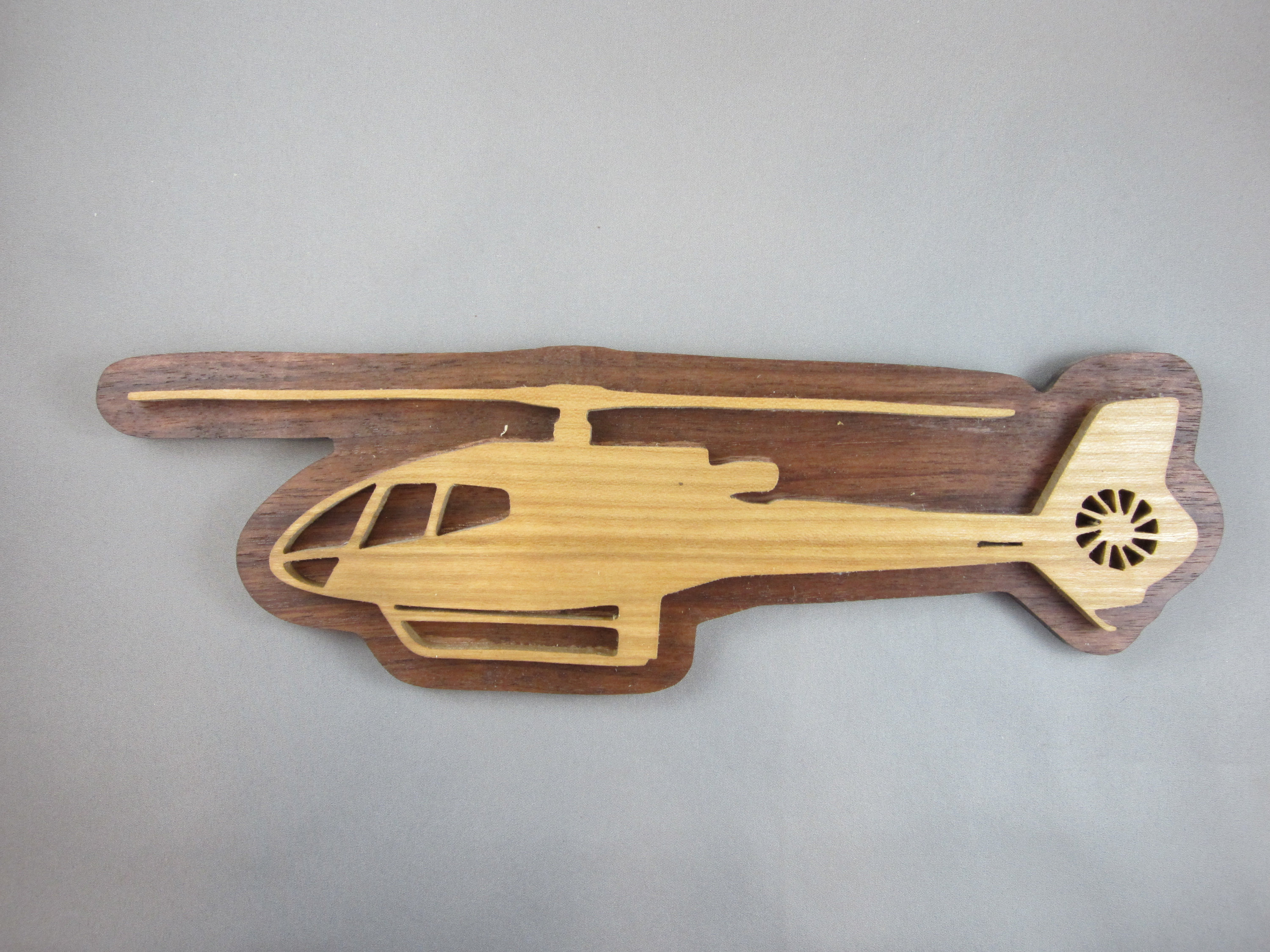 The Eurocopter EC 130B is handmade on a scroll saw. It is made from Cherry wood and has a walnut backer.